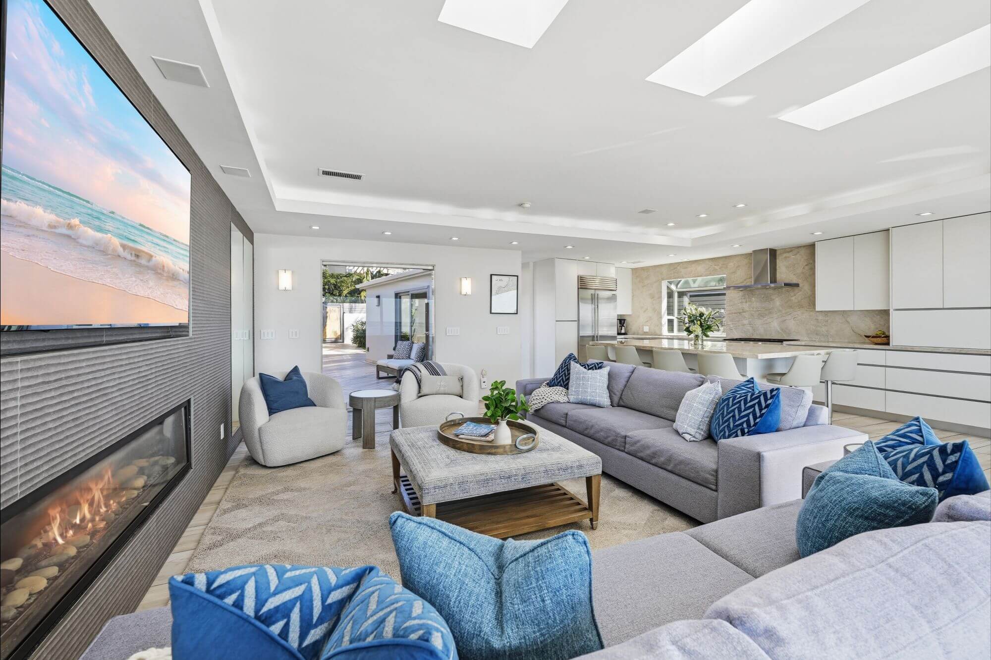 • Main Living Area: Open floorplan with sofa, fireplace, TV.