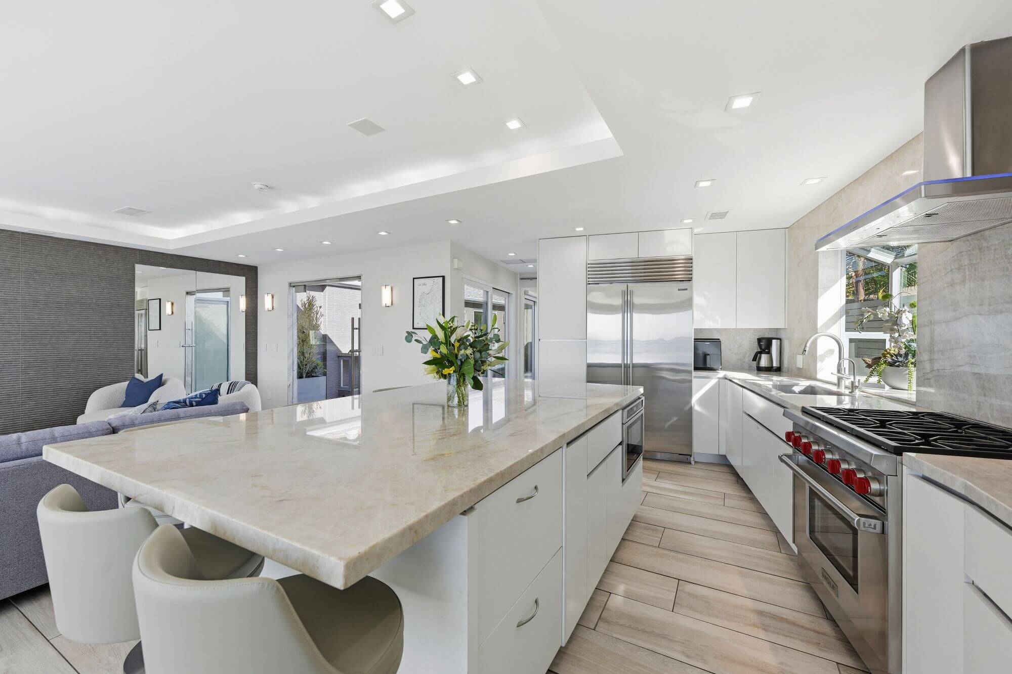 • Gourmet Kitchen: High-end appliances and island bar seating.