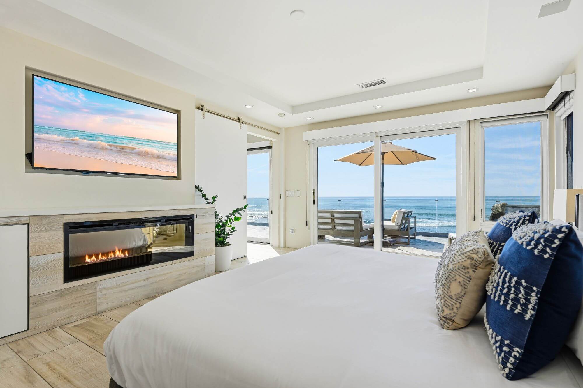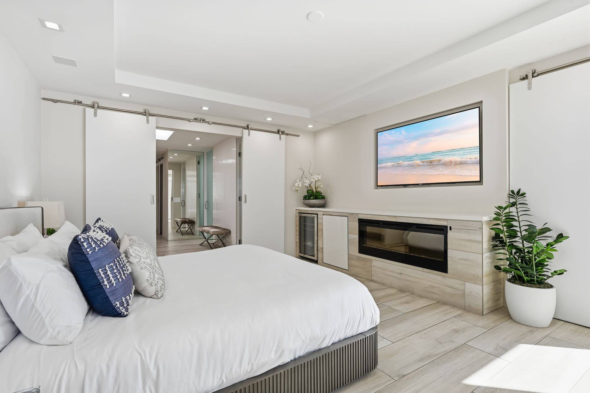 • Bedroom 1 (Primary): King bed, fireplace, convenience fridge, TV.